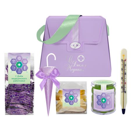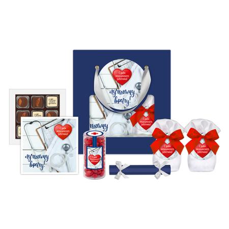 - Наборы конфет ассорти с медицинской символикой и пожеланиями;