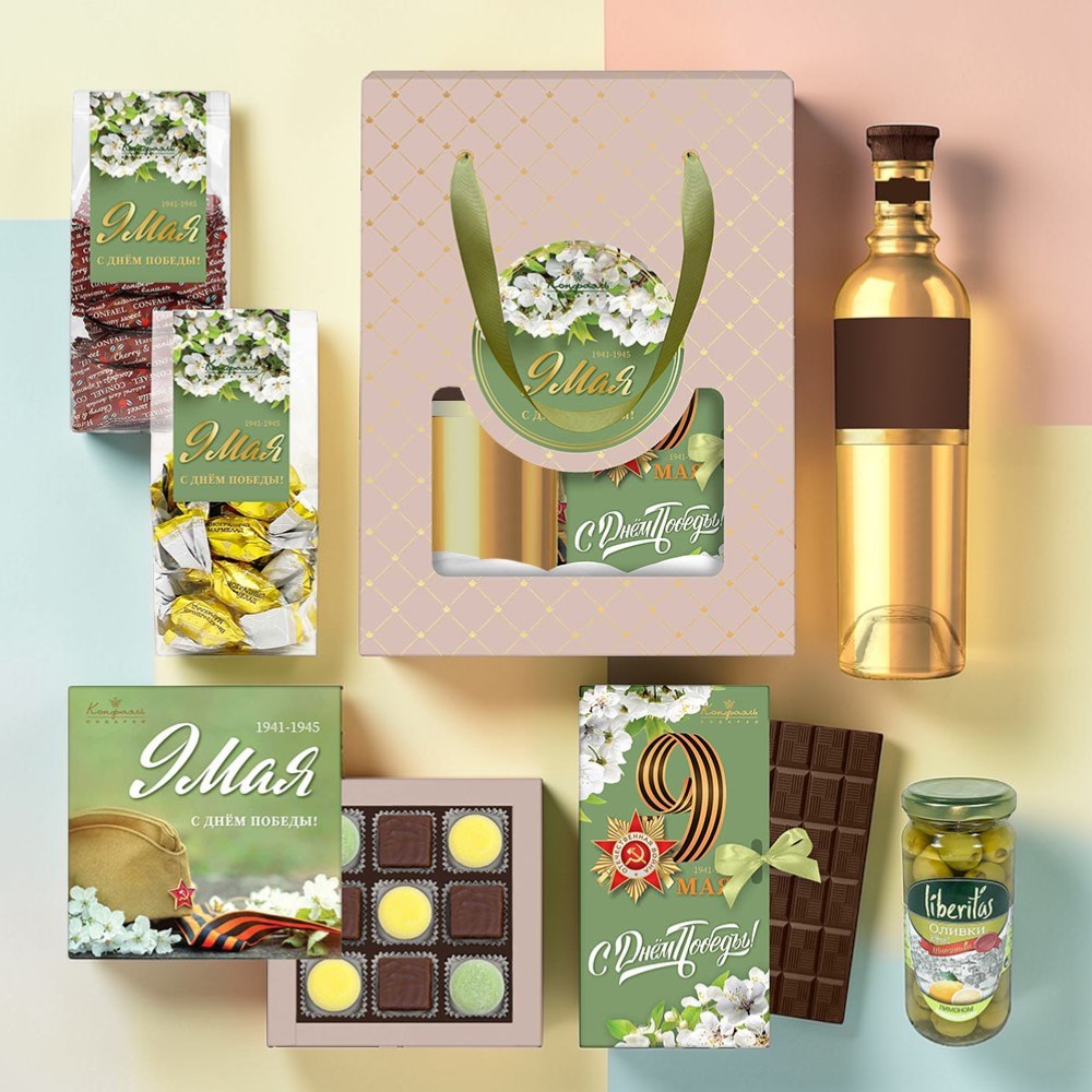 Плитка малая «С Днем Победы!»/ Шоколад молочный / 150г Поздравление 09 / Конфеты «Суфле» вгорьком шоколаде (ванильное), мармеладжелейный со вкусами «Банан», «Зеленая дыня» / 110 г Мини-пакет 02 / Конфеты «Комбинированные» в горьком шоколаде (вишня и ваниль) / 150 г Мини-пакет 02 / Конфеты«Желейные» в горьком шоколаде (виноградные) / 150 г Оливки зеленые с лимоном Liberitas / 240 г