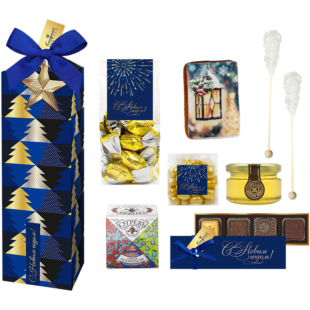 Поздравление малое 04/01/ Шоколадные конфеты «Ассорти» со сливочной и кремовой начинками, с кремовой начинкой и декором, конфета «Суфле» в горьком шоколаде (ананасовое) / 30 г Мини-пакет 02 / Конфеты «Желейные» в горьком шоколаде (виноградные) / 150 г Мини-пакет 01 / Драже «Ананас» в белом шоколаде с декором / 75 г Сувенирный пряник ручной работы / 50 г Мед натуральный липовый / 150 г Чай «СУГРЕВЪ» По-карельски /Зеленый чай с вереском и незабудками / 25 г Сахар леденцовый на палочке белый / 13 г / 2 шт.