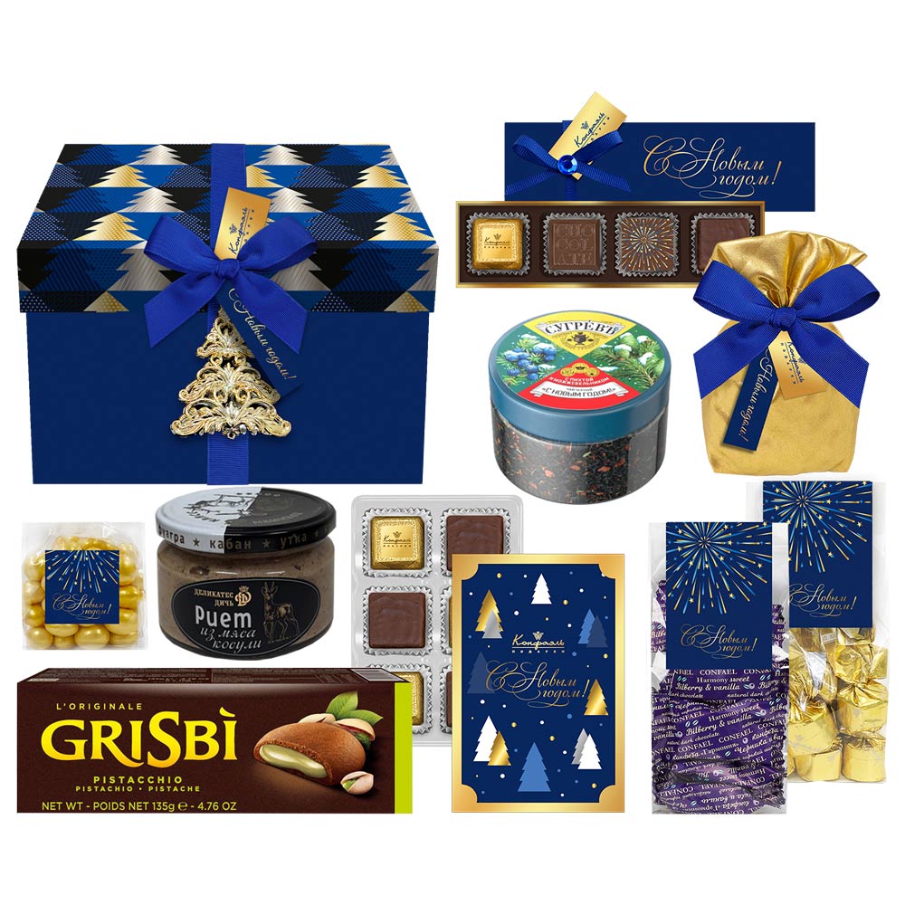 Поздравление малое 04/01 / Шоколадные конфеты «Ассорти» со сливочной и кремовой начинками, с кремовой начинкой и декором, конфета «Суфле» в горьком шоколаде (ананасовое) / 30 г Поздравление 06 / Шоколадные конфеты «Ассорти» со сливочной начинкой, конфеты «Суфле» в горькомшоколаде (ананасовое) / 45 г Мини-пакет 02 / Конфеты «Комбинированные» в горьком шоколаде (черника и ваниль) / 150 г Мини-пакет 02 / Шоколадные конфеты «Ассорти» с шоколадной начинкой / 150 г Мешок 002 / Драже«Миндаль» в молочном шоколаде / 150 г Мини-пакет 01 / Драже «Ананас» в белом шоколаде с декором / 75 г Риет из мяса косули с грушей и мягким сыром / 200 г Печенье с фисташковой начинкой ТМ GRISBI / 135 г Чай «СУГРЕВЪ» «С Новым Годом!» / Новогодний чай с оттенками хвои и можжевельника / 60 г