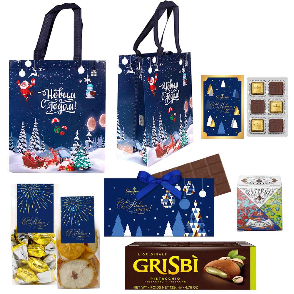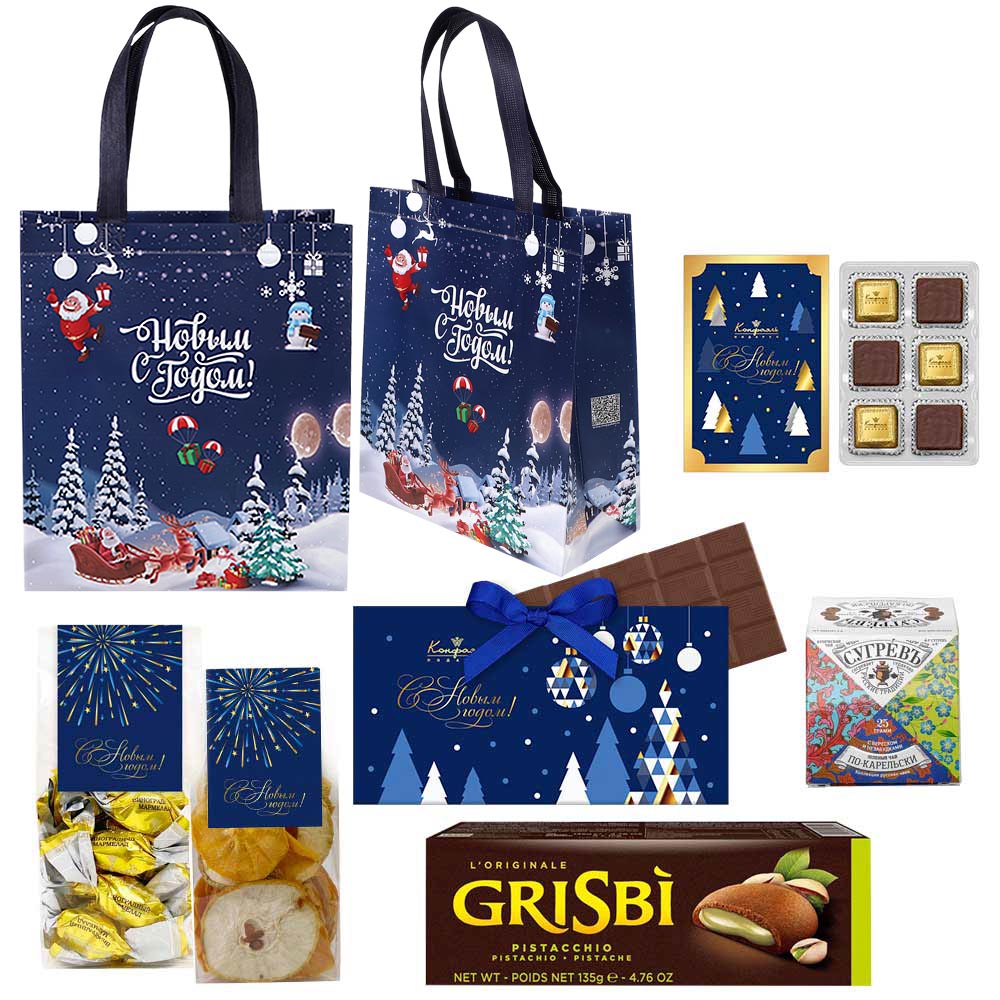 Плитка малая «С НОВЫМ ГОДОМ!» / Шоколад молочный 60 г - Печенье с фисташковой начинкой ТМ GRISBI / Италия / 135 г - Поздравление 06 / Шоколадные конфеты «Ассорти» со сливочной начинкой, конфеты «Суфле» в горьком шоколаде (ананасовое) 45 г - Мини-пакет 02 / Фруктовые чипсы в ассортименте / 100 г - Мини-пакет 02 / Конфеты «Желейные» в горьком шоколаде (виноградные) 150 г - СУГРЕВЪ» По-карельски / Зеленый чай с вереском и незабудками 25 г Возможность брендирования: - стикер / бирка с логотипом