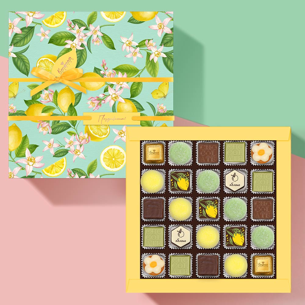 Шоколадные конфеты «Ассорти» со сливочными и кремовойначинками, с кремовой начинкой идекором, мармелад желейный со вкусами «Банан», «Зеленая дыня», конфеты «Суфле» вгорьком шоколаде (лимонное), мармеладжелейный «Апельсиновый» с декором,конфеты «Желейные» в горьком шоколаде с декором (яблочные)