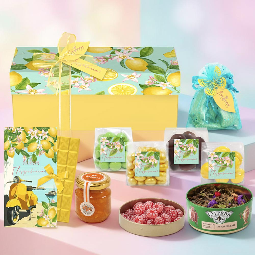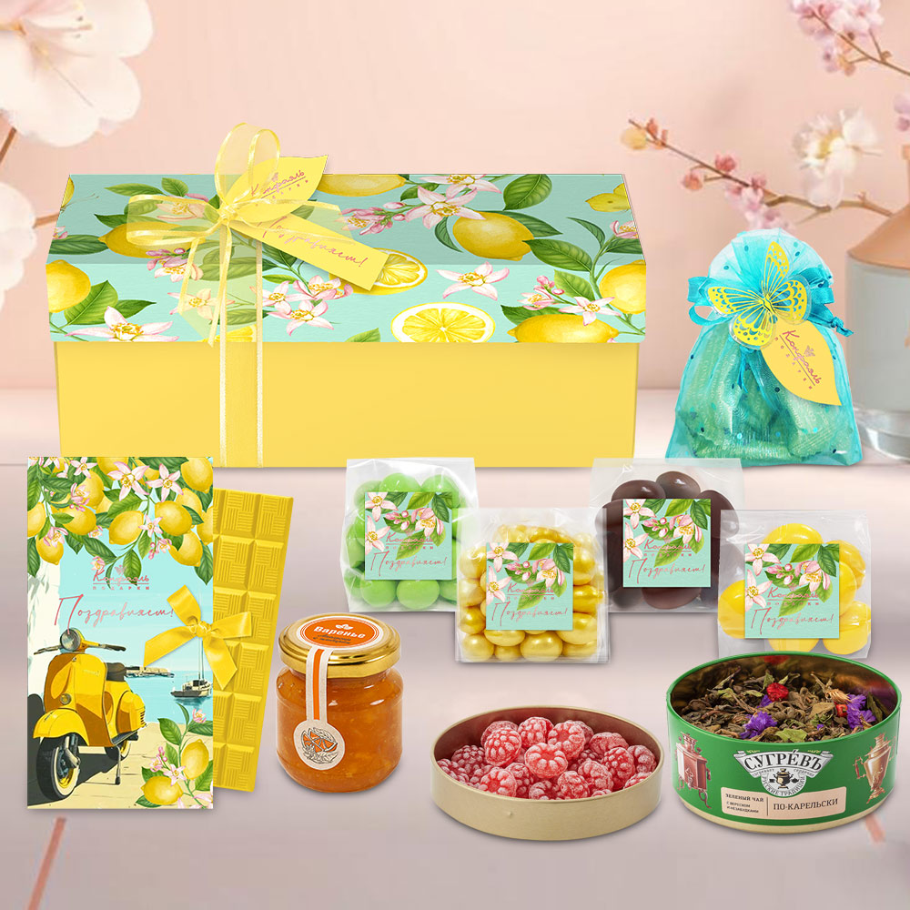 Плитка малая «Поздравляем!» / Шоколад белый с лимоном / 60г Мешок 012 / Конфеты«Комбинированные» вгорькомшоколаде(виноградиваниль)/90г Мини-пакет 01 / Драже «Ананас» в белом шоколаде с декором / 75г Мини-пакет 01 / Драже «Лимон» в шоколаде / 90г Мини-пакет 01 / Драже «Мармеладжелейный в шоколаде «Яблоко» / 90г Мини-пакет 01 / Драже «Миндаль» вмолочном шоколаде / 75г Варенье «Апельсин с имбирем» / 150г Чайный набор ТМ «СУГРЕВЪ» «По-корельски» / Чай зеленый с вереском и незабудками, карамель леденцовая со вкусом малины / 90 г