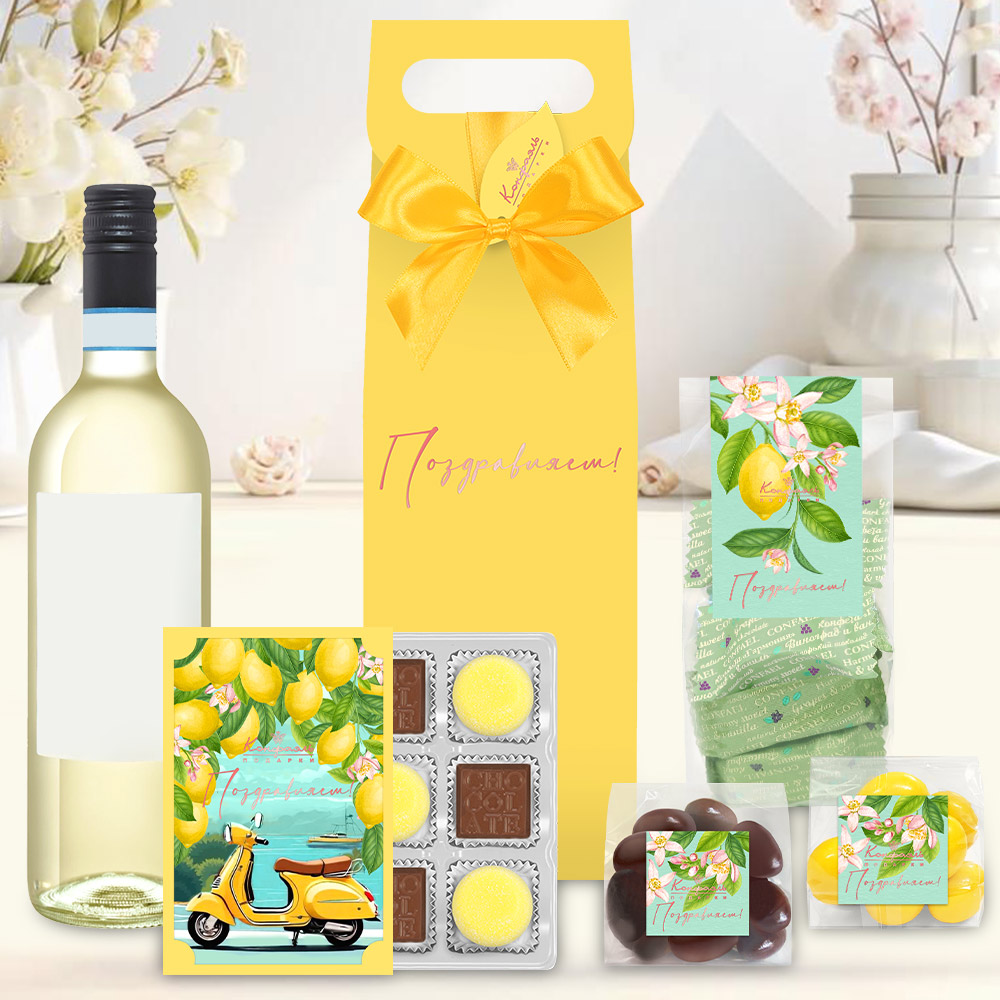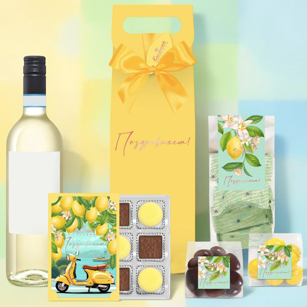 Поздравление 06 / Шоколадныеконфеты «Ассорти» с кремовой начинкой, мармелад желейный со вкусом «Банан» / 80 г Мини-пакет 02 / Конфеты «Комбинированные» в горьком шоколад (виноград и ваниль) / 150г Мини-пакет 01 / Драже «Лимон» в шоколаде / 90 г Мини-пакет 01 / Драже «Миндаль» в молочном шоколаде / 75 г