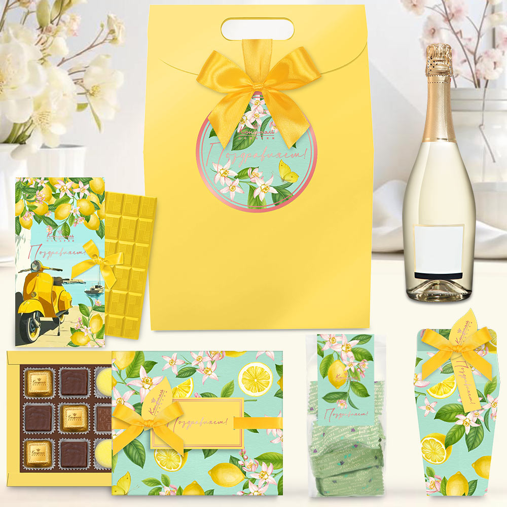 Плитка малая «Поздравляем!» /Шоколад белый с лимоном / 60г Поздравление 12 / Шоколадныеконфеты «Ассорти» со сливочной и кремовой начинками, мармелад желейный со вкусом «Банан»,конфеты «Суфле» в горьком шоколаде (лимонное) / 125 г Подарок 081 / Конфеты «Сухофрукты» в горьком шоколаде (финик, слива, абрикос) / 155г Мини-пакет 02 / Конфеты «Комбинированные» вгорькомшоколаде(виноградиваниль)/150г