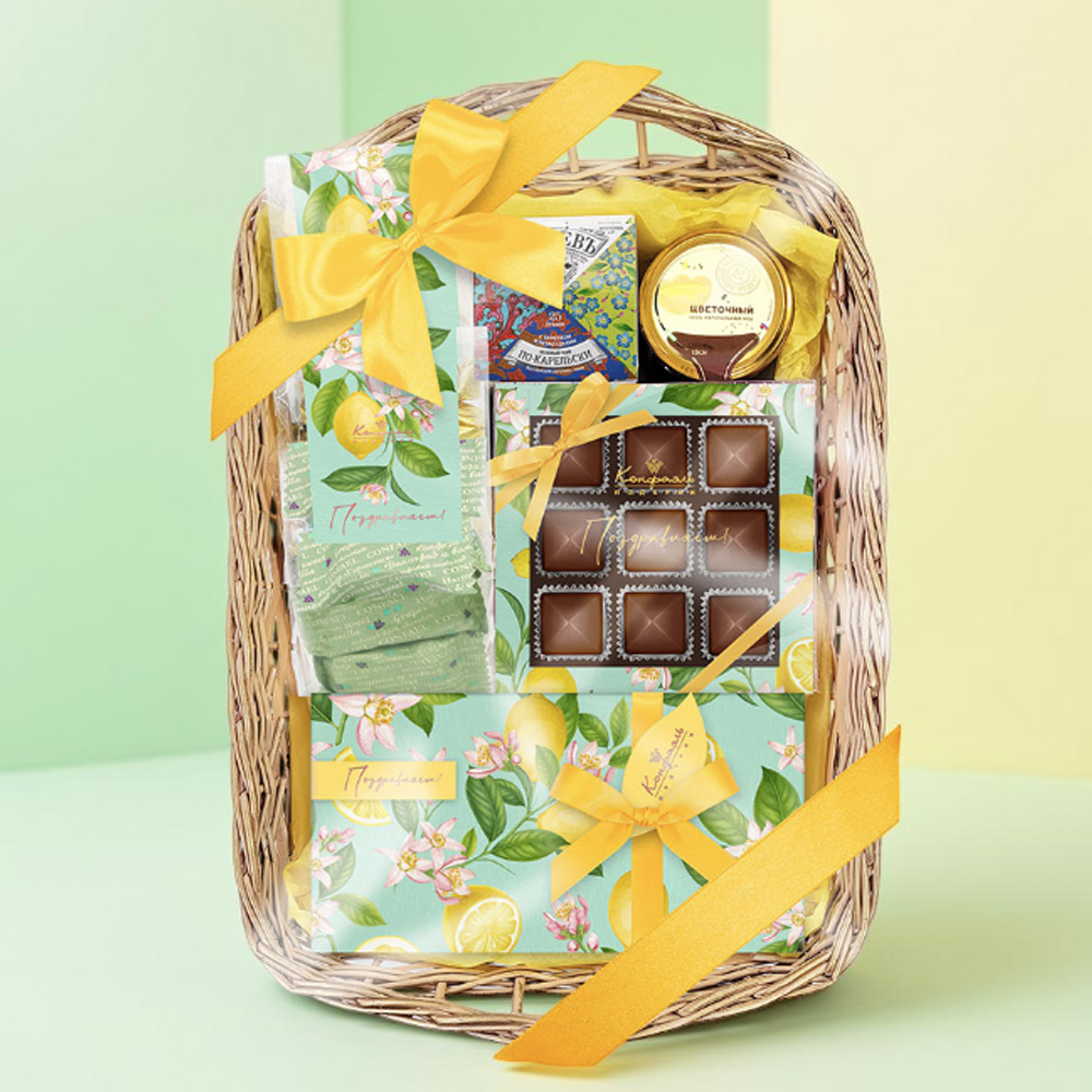 Поздравление 09/ Шоколадные конфеты «Ассорти» с шоколадное начинкой/ 95 г Подарок 019/ Мармелад желейный со вкусами «Сливочная намелака», «Зеленая дыня», «Банан»/ 255 г Мини-пакет 02/ Конфеты «Комбинированные» в горьком шоколад(виноград и ваниль)/ 150 г Мини-пакет 02/ Шоколадные конфеты «Ассорти» с шоколадной начинкой/ 150 г Мед натуральный цветочный/ 150 г Чай «СУГРЕВЪ» По-карельски/ Зеленый чай с вереском и незабудками/ 25 г