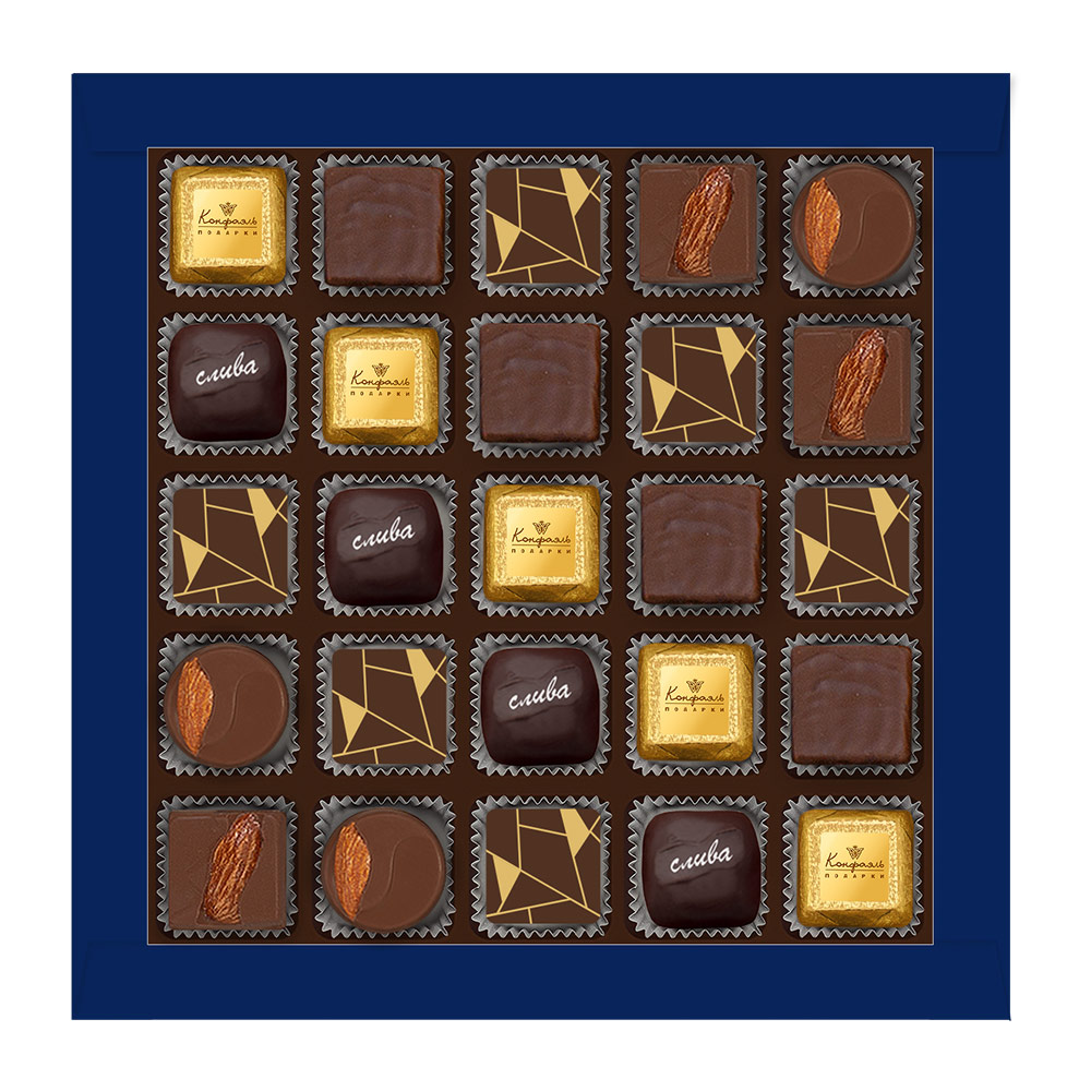 Шоколадные конфеты «Ассорти» со сливочными начинками, с кремовой начинкой и декором, шоколад молочный с миндалем, конфеты «Сухофрукты» в горьком шоколаде (слива), конфеты «Суфле» в горьком шоколаде со вкусом «Банан»