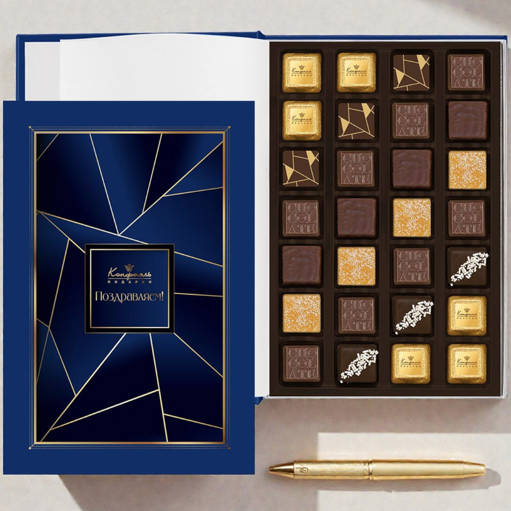 Шоколадные конфеты«Ассорти» со сливочными и кремовойначинками, с кремовой начинкой и декором, конфеты «Суфле» в горьком шоколаде со вкусом «Банан», конфеты «Мягкий грильяж» в горьком шоколаде, мармелад желейный «Апельсиновый»