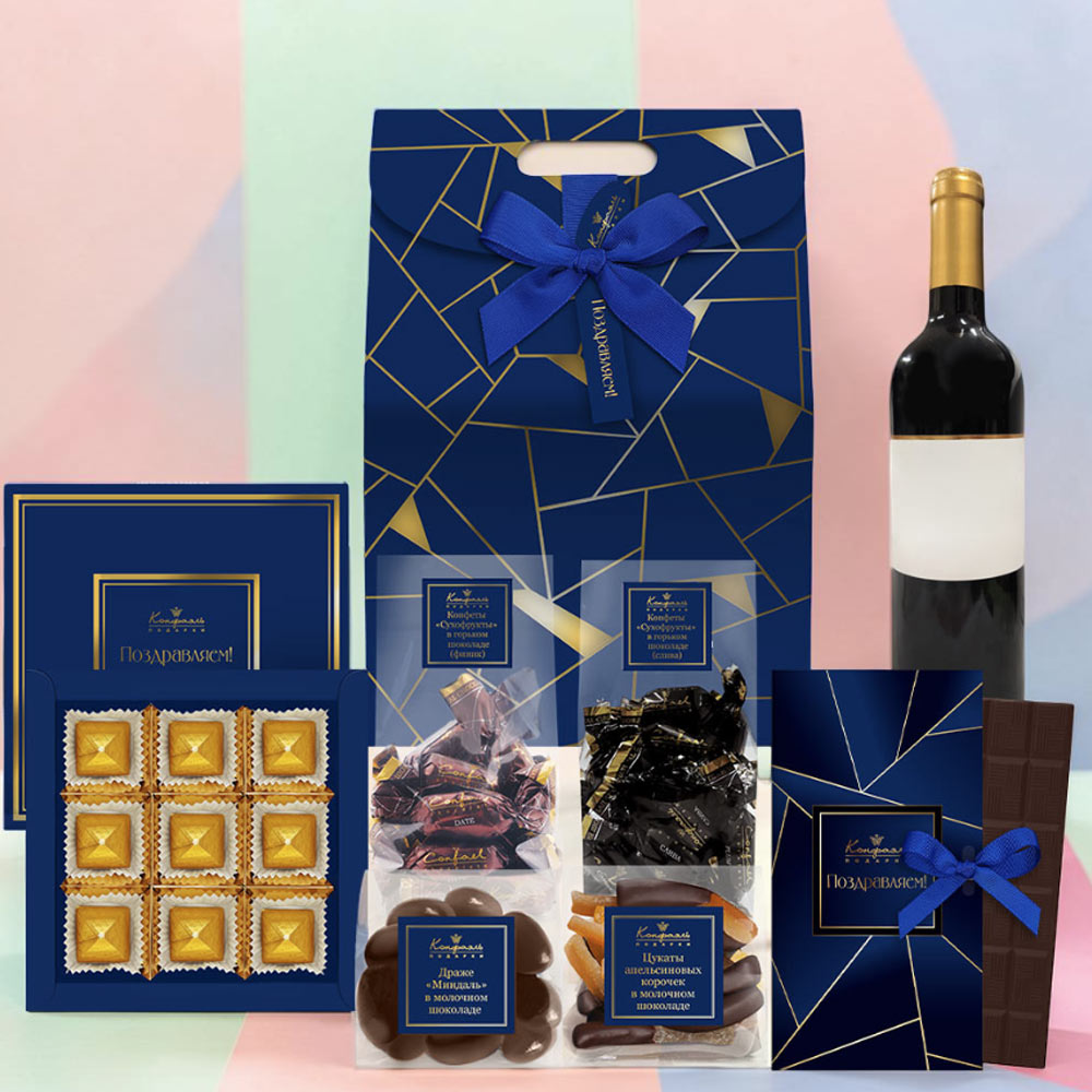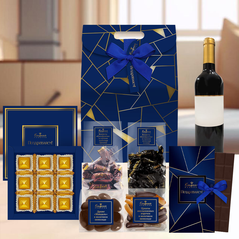 Поздравление 09 / Шоколадгорький фигурный / 115г Плитка малая «Поздравляем!»/ Шоколад горький / 60 г Мини-пакет 02 / Конфеты «Сухофрукты» в горьком шоколаде (слива) / 155 г Мини-пакет 02 / Конфеты«Сухофрукты» в горьком шоколаде (финик) / 155 г Мини-пакет 01 / Цукаты апельсиновых корочек в молочном шоколаде / 50 г Мини-пакет 01 / Драже«Миндаль» в молочном шоколаде / 75 г