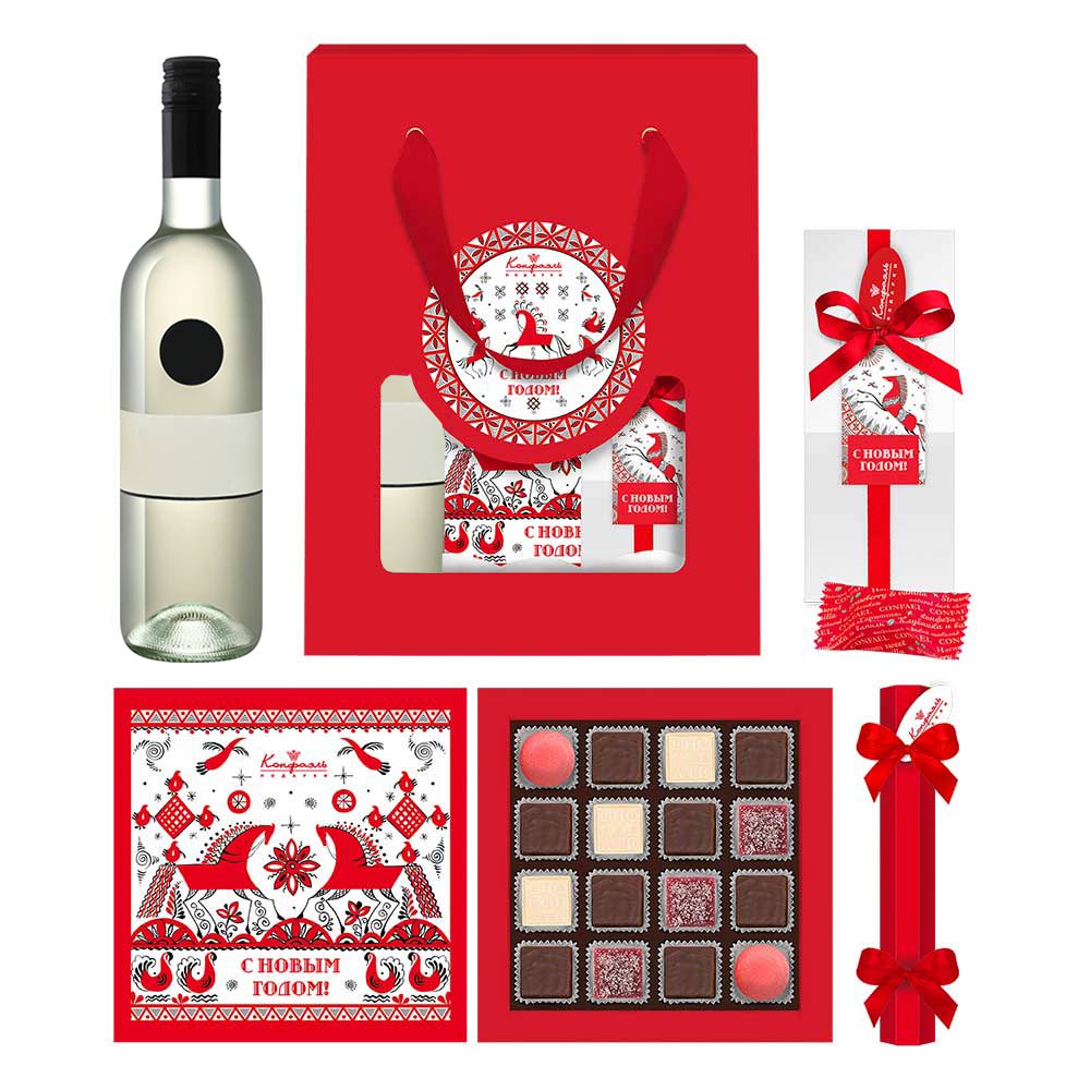Поздравление 16 / Шоколадные конфеты «Ассорти» с кремовой начинкой, конфеты «Суфле» в горьком шоколаде (ананасовое), мармелад желейный «Сливовый», мармелад желейный со вкусом «Личи» / 145 г Подарок 050 / Конфеты «Комбинированные» в горьком шоколаде (клубника и ваниль) / 150 г Мини-подарок 001 / Конфеты «Сухофрукты» в горьком шоколаде (финик, слива, абрикос) / 35 г