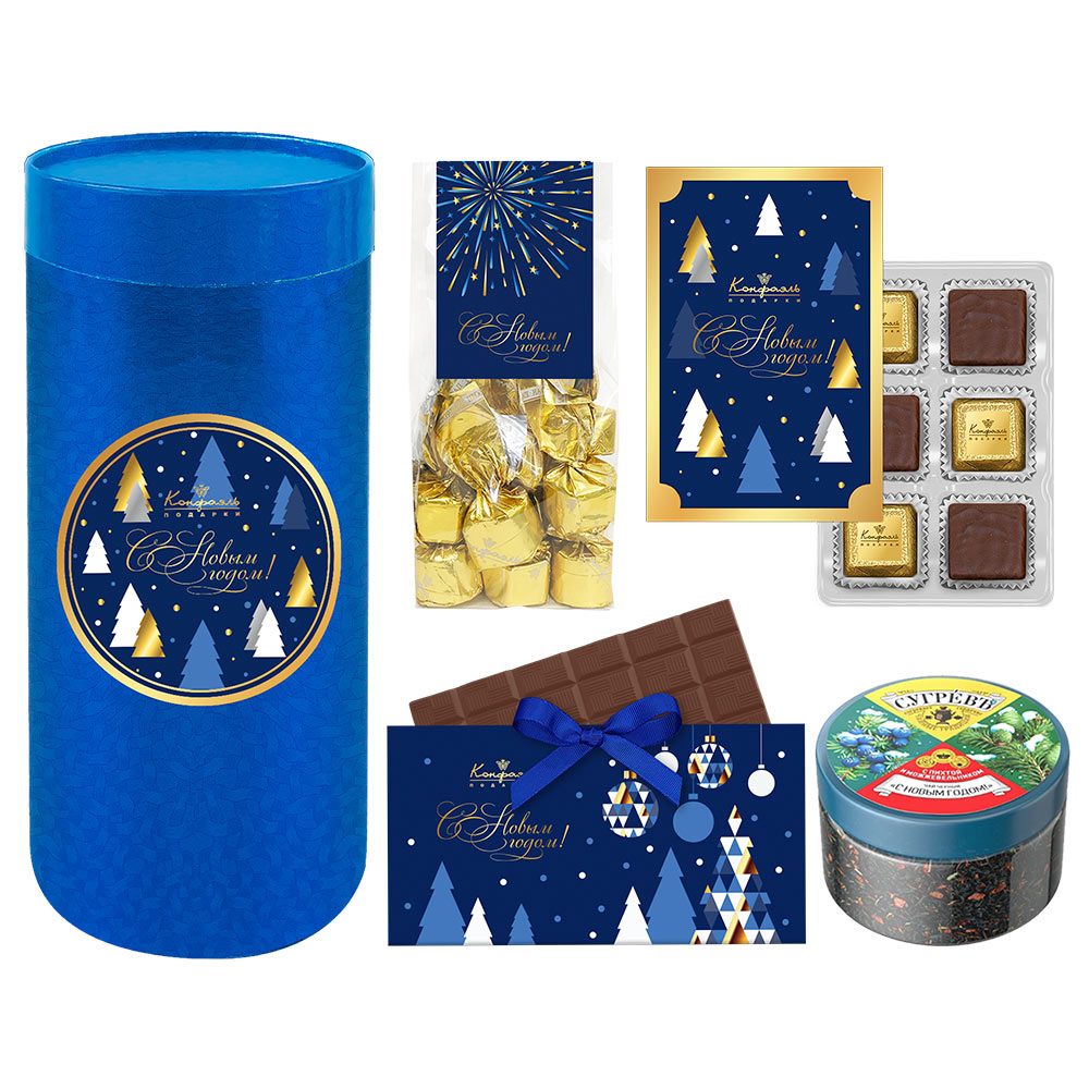 Плитка малая «С Новым годом!» / Шоколад молочный / 60 г Поздравление 06 / Шоколадныеконфеты «Ассорти» со сливочной начинкой, конфеты «Суфле» в горькомшоколаде (ананасовое) / 45 г Мини-пакет 02 / Шоколадные конфеты «Ассорти» с шоколадной начинкой / 150 г Чай «СУГРЕВЪ» «С Новым Годом!» / Новогодний чай с оттенками хвои и можжевельника / 60г