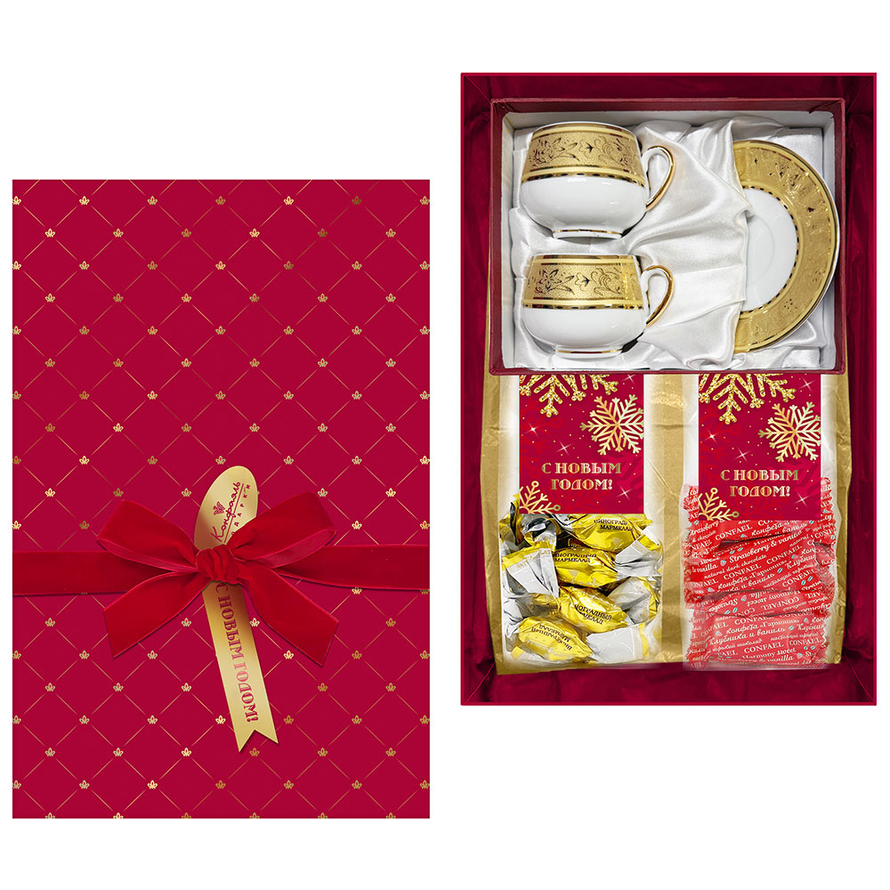 Мини-пакет 02 / Конфеты «Желейные» в горьком шоколаде (виноградные) / 150 г Мини-пакет 02 / Конфеты «Комбинированные» в горьком шоколаде (клубника и ваниль) / 150 г Набор кофейный «Золото на белом» / 4 предмета