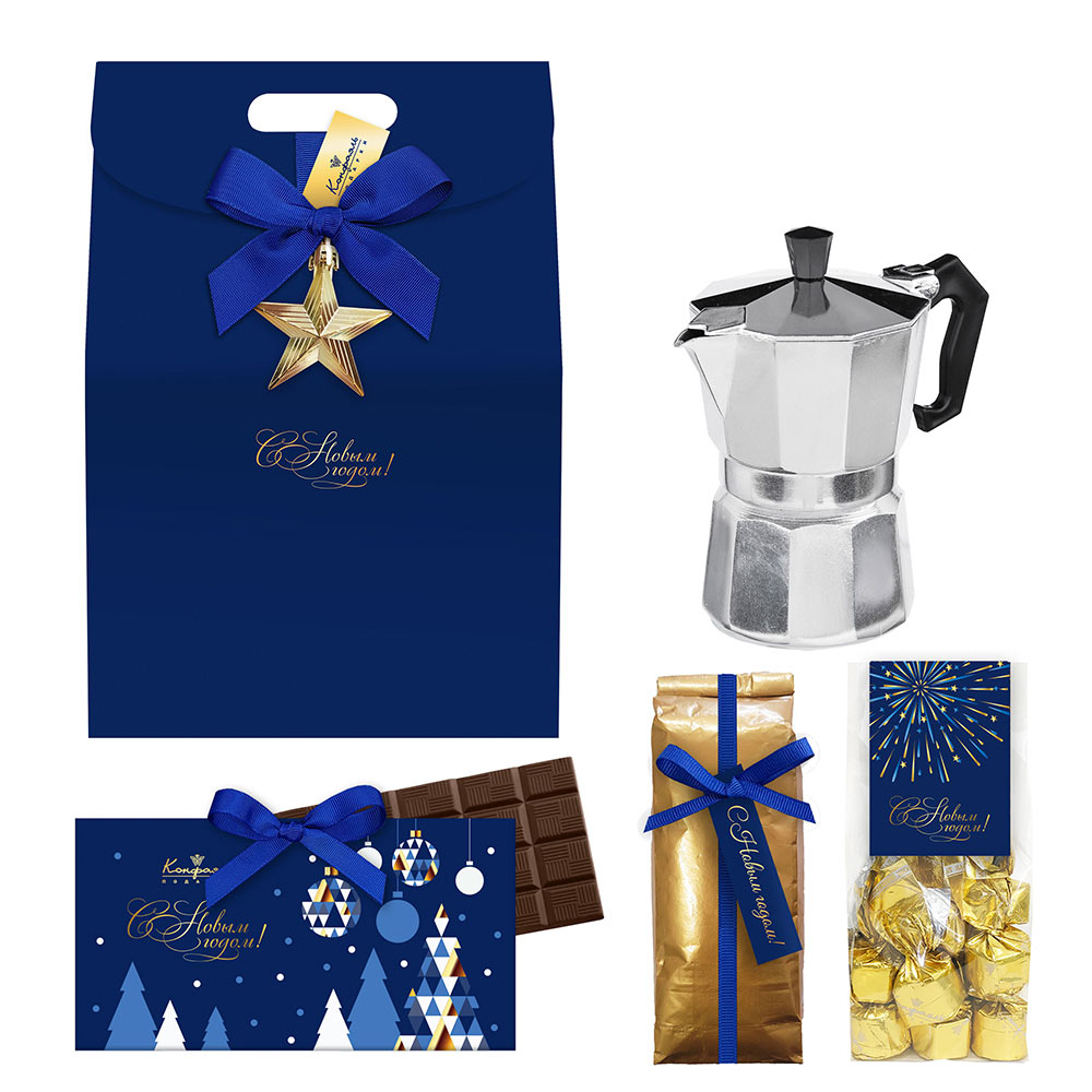Плитка малая «С Новым годом!» / Шоколад молочный / 60 г Мини-пакет 02 / Шоколадныеконфеты «Ассорти» с шоколадной начинкой / 150 г Кофе АMADO «Итальянская обжарка» (в зернах) / 100 г Кофеварка