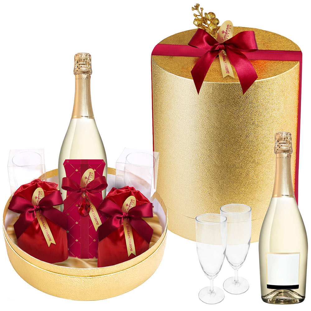 Подарок 132 / Конфеты «Комбинированные» в горьком шоколаде (клубника и ваниль) Мешок 003 / Драже«Миндаль» в молочном шоколаде / 250 г Мешок 003 / Драже«Клубника» в шоколаде / 250 г Бокал по шампанское «BANQUET» / 2 шт.
