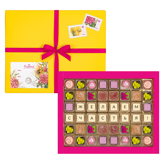 Шоколадные конфеты «Ассорти» со сливочной начинкой, со сливочной и желейными начинками и декором, мармелад желейный «Апельсиновый», «Клубничный», драже «Фундук» в горьком шоколаде с декором, шоколад белый фигурный с декором