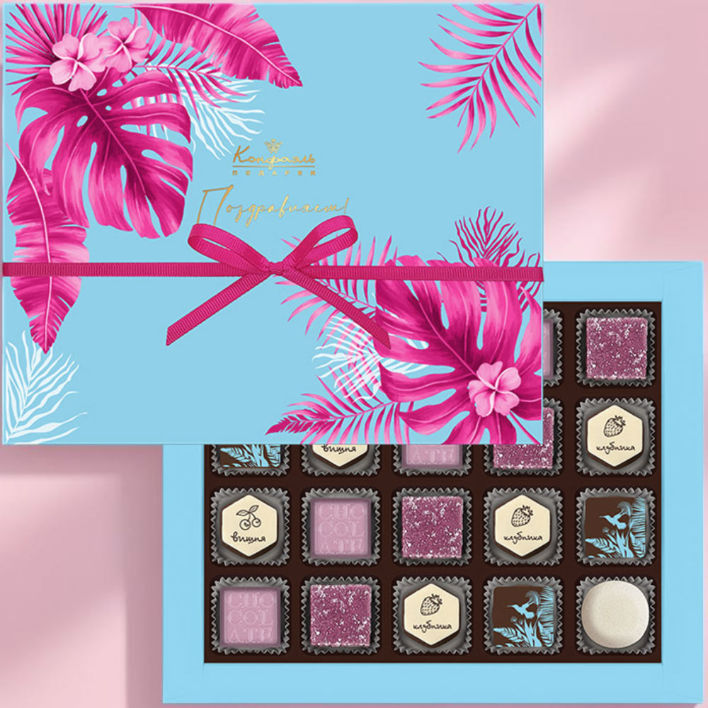 Шоколадные конфеты «Ассорти» со сливочной начинкой, с кремовой начинкой и декором, конфеты «Желейные» в горьком шоколаде с декором (клубничные, вишневые), мармелад желейный «Черничный», мармелад желейный со вкусом «Сливочная намелака»