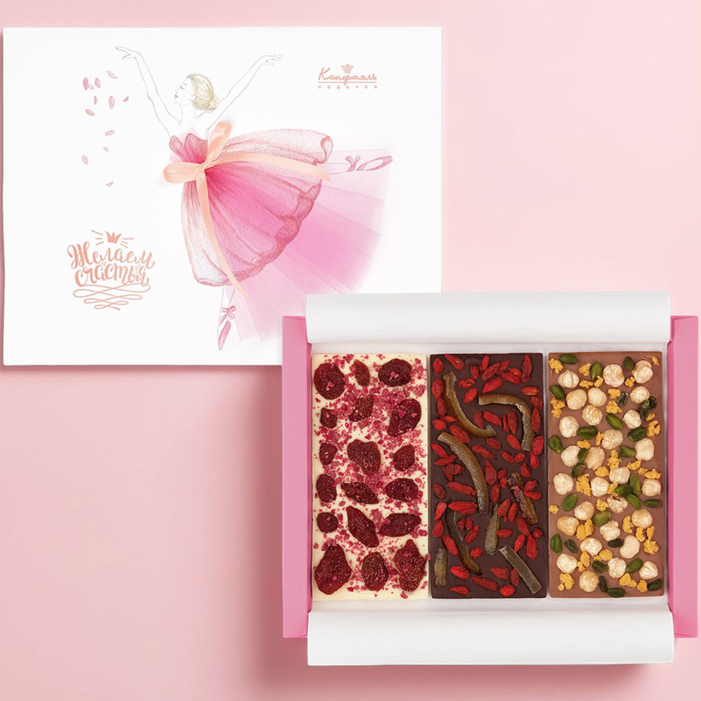 Шоколад горький с ягодами годжи и цукатами апельсиновых корочек, шоколад молочный с фундуком, фисташками и апельсиновыми кранчами, шоколад белый с клубникой и малиновыми кранчами