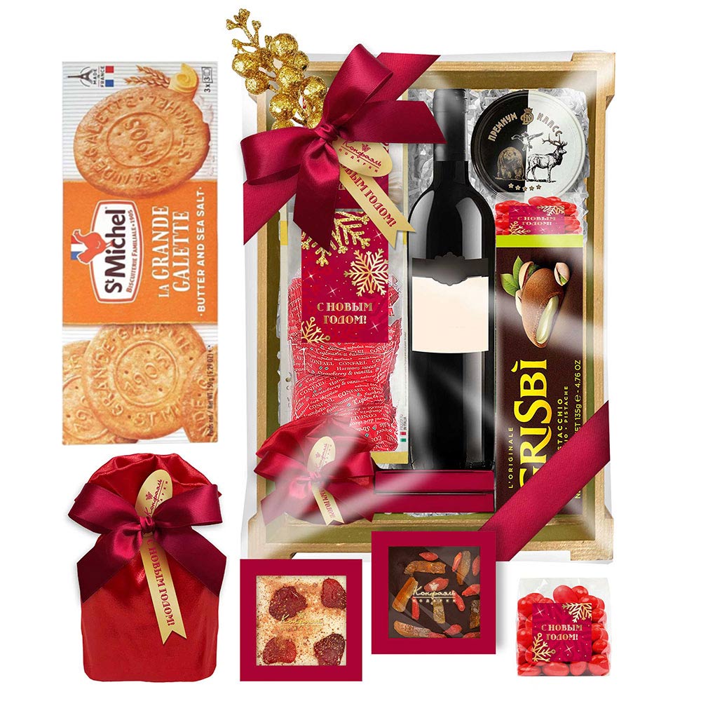 Мешок 003 / Драже «Миндаль» в молочном шоколаде / 250 г Мини-пакет 02 / Конфеты «Комбинированные» в горьком шоколаде (клубника и ваниль) / 150 г Мини-пакет 02 / Меренги воздушные, меренги воздушные со вкусом персика / 70 г Мини-пакет 01 / Драже «Клюква» в шоколаде / 75 г Шоколадный комплимент / Шоколад белый с клубникой и малиновым кранчем / 35 г Шоколадный комплимент / Шоколад молочный с цукатами из апельсиновых корочек и ягодами Годжи / 35 г Печенье с фисташковой начинкой ТМ GRISBI / 135 г Риет из мяса косули с грушей и мягким сыром / 200 г Печенье сливочное с морской солью"St Michel" 150 г