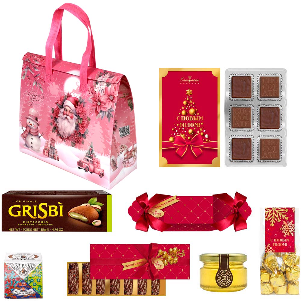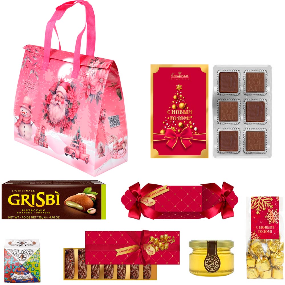 : - Мини-пакет 02 / Шоколадные конфеты «Ассорти» с шоколадной начинкой 150 г - Поздравление 06 / Шоколадные конфеты «Ассорти» с кремовой начинкой, конфеты «Суфле» в горьком шоколаде со вкусом Просекко Розе 45 г - СУГРЕВЪ По-карельски / Зеленый чай с вереском и незабудками 25 г - Печенье с фисташковой начинкой ТМ GRISBI / Италия 135 г - Подарок 003 / Конфеты «Суфле» в горьком шоколаде (ванильное, шоколадное, кофейное) 60 г - Подарок 058 / Конфеты «Комбинированные» в горьком шоколаде (вишня и ваниль) 105 г - Мед натуральный липовый 150 г Возможность брендирования: - стикер / бирка с логотипом