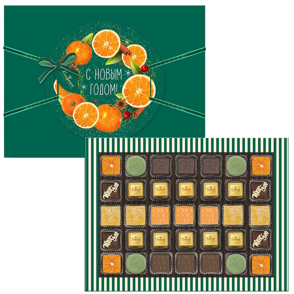 Мармелад желейный «Апельсиновый», шоколадные конфеты «Ассорти» с кремовой и сливочными начинками, с кремовой начинкой и декором, конфеты «Суфле» в горьком шоколаде (апельсиновое), мармелад желейный со вкусом «Зеленая дыня»
