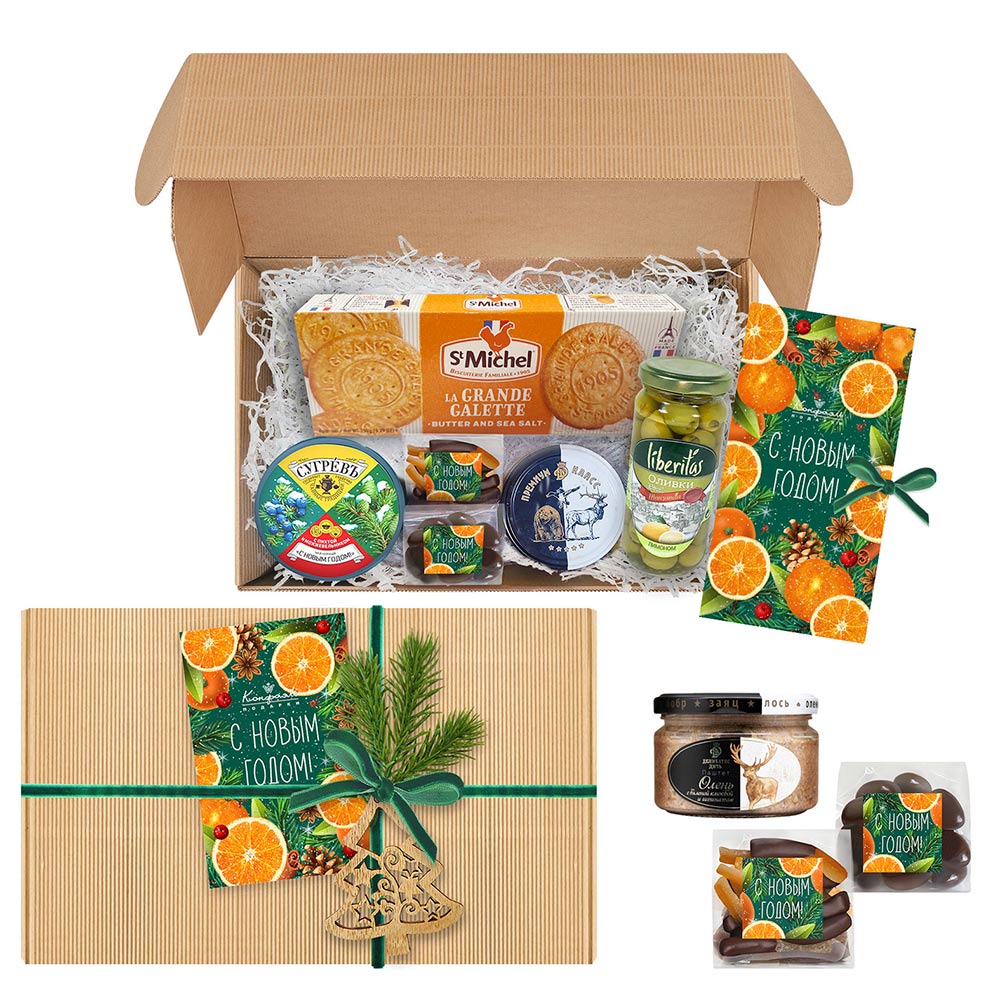 Плитка малая «С Новым годом!» / Шоколад молочный / 60 г Мини-пакет 01 / Драже«Миндаль» в молочном шоколаде / 75 г Мини-пакет 01 / Цукаты изапельсиновых корочек в молочном шоколаде / 50 г Оливки зеленые с лимоном / 240 г Паштет из оленины с вяленой клюквой и шпинатом / 200 г Чай «СУГРЕВЪ» «С Новым Годом!»/ Новогодний чай с оттенками хвои и можжевельника / 60г Печенье сливочное с морской солью"St Michel" 150г