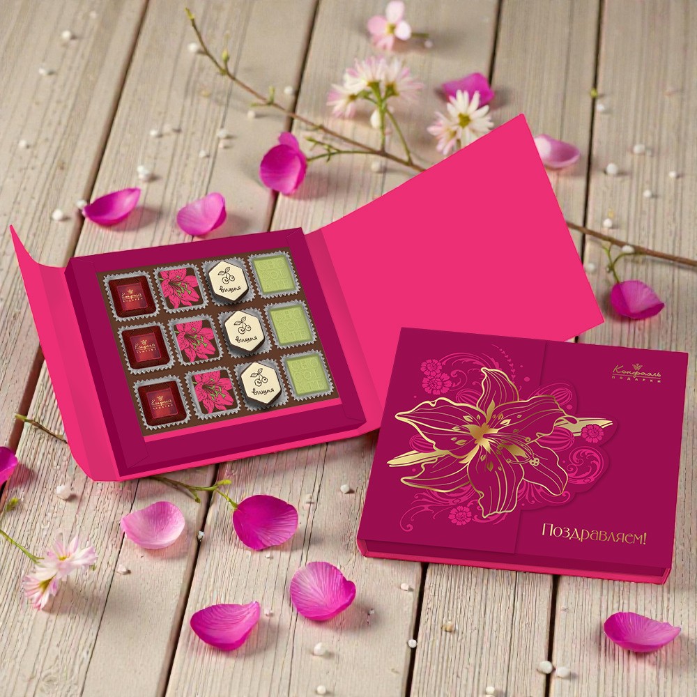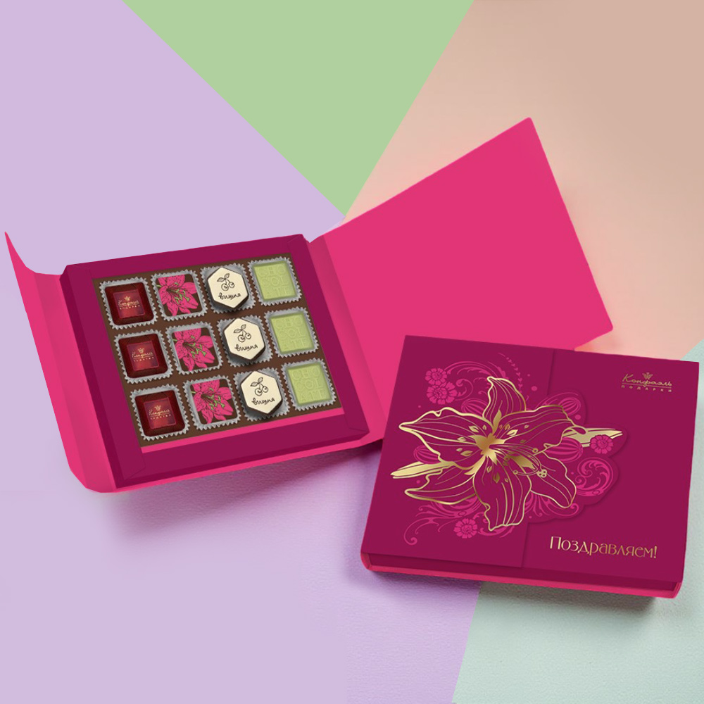 Шоколадные конфеты «Ассорти» со сливочными начинками, с кремовой начинкой и декором, конфеты «Желейные» в горьком шоколаде с декором (вишневые)