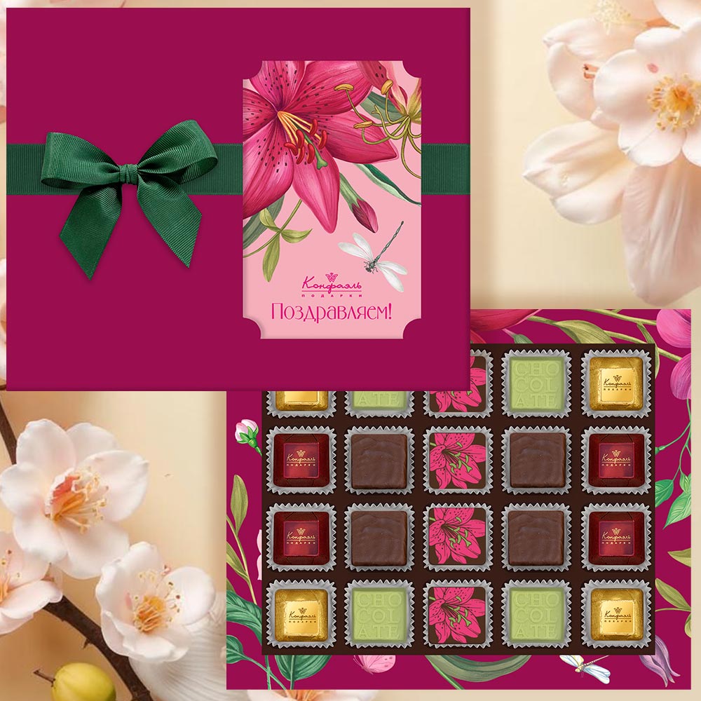 Шоколадные конфеты «Ассорти» со сливочными начинками, с кремовой начинкой и декором, конфеты «Суфле» в горьком шоколаде со вкусом «Игристого розе»