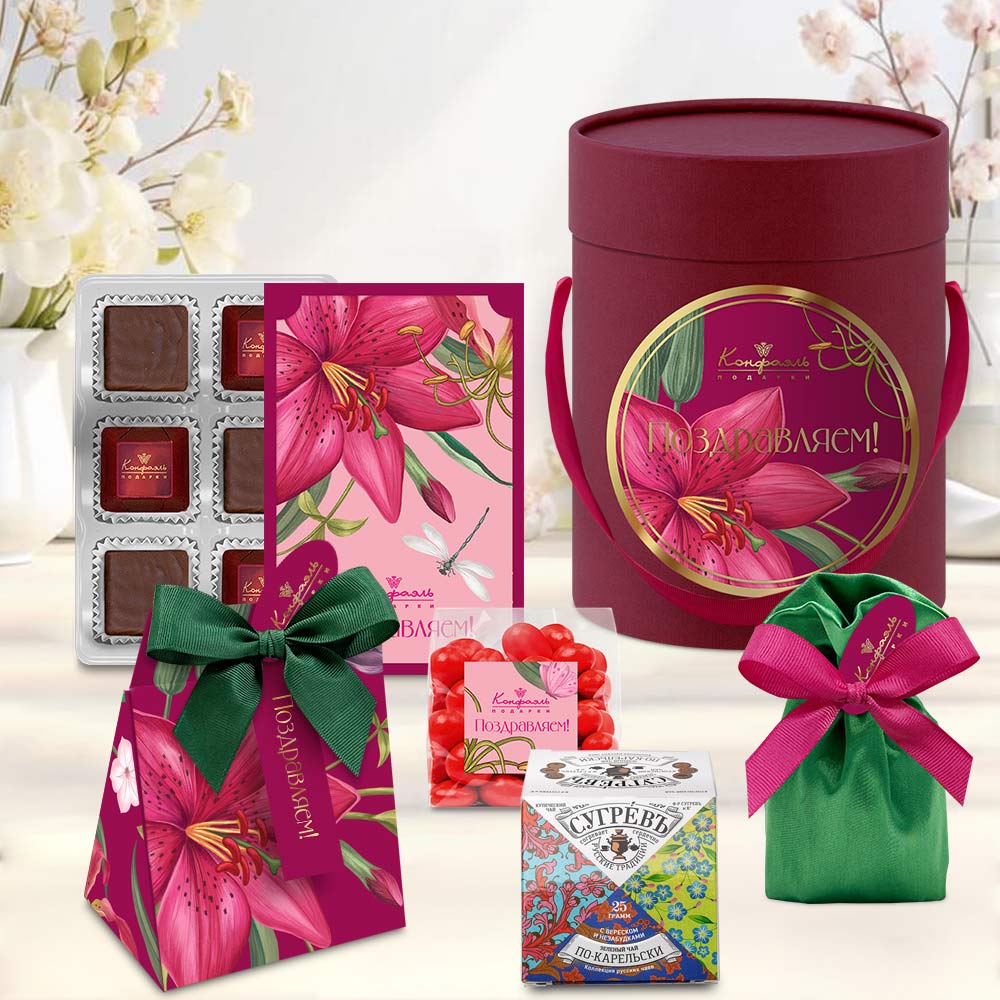 Поздравление 06 / Шоколадныеконфеты «Ассорти» со сливочными начинками, конфеты «Суфле» в горьком шоколаде со вкусом «Игристого розе» / 45 г Подарок 078 / Конфеты «Сухофрукты» в горьком шоколаде (финик, слива, абрикос) / 100 г Мешок 001 / Драже «Миндаль» в молочном шоколаде / 100 г Мини-пакет 01 / Драже «Клюква» в шоколаде / 75 г Чай «СУГРЕВЪ» По-карельски / Зеленый чай с вереском и незабудками / 25 г