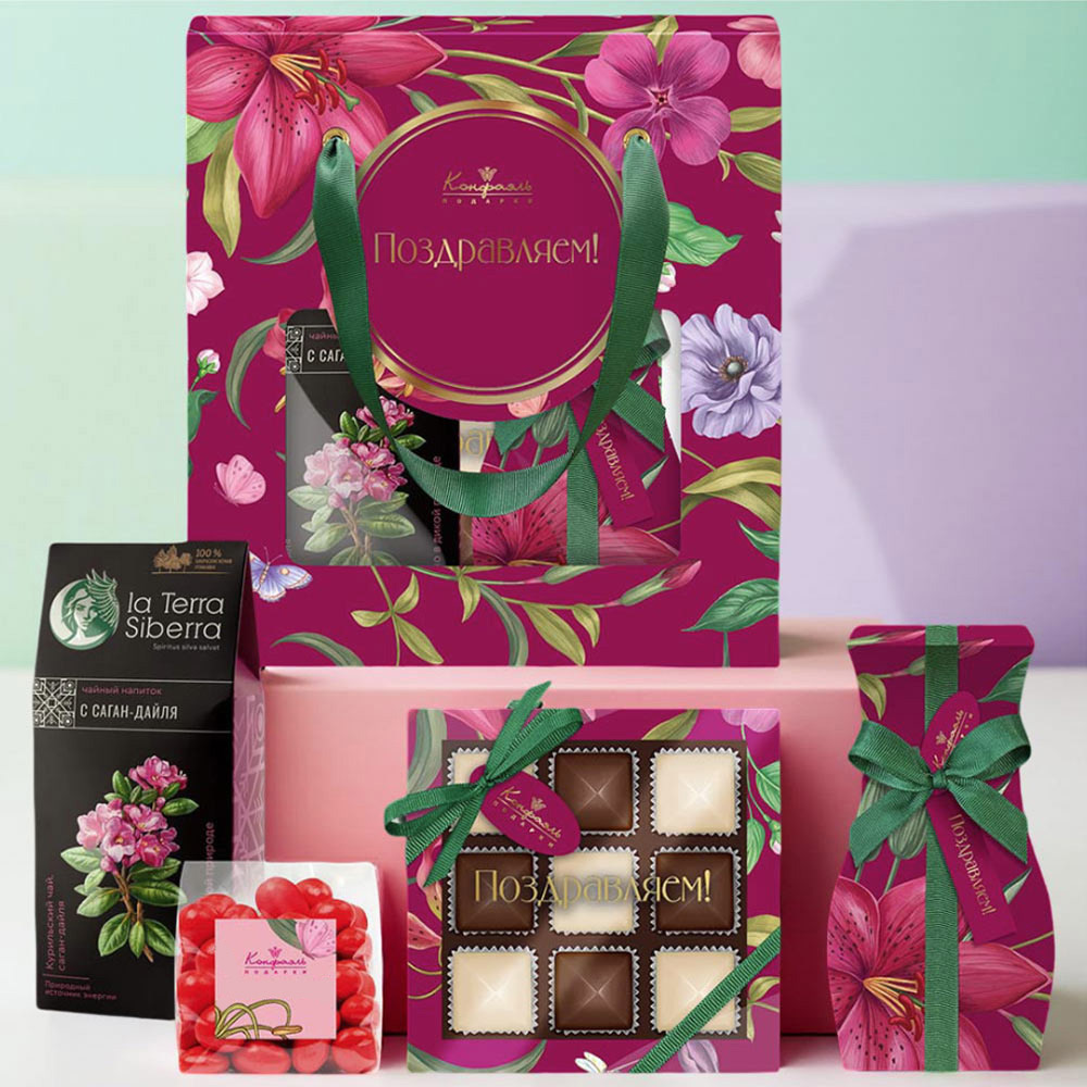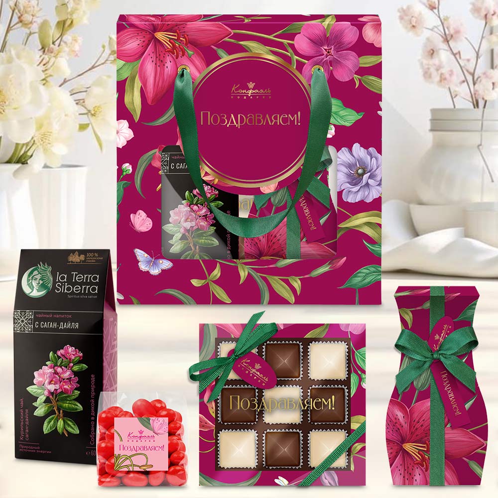 Поздравление 09 / Шоколадные конфеты «Ассорти» с шоколадной и кремовой начинками / 95 г Подарок 132 / Конфеты «Желейные» в горьком шоколаде (черничные) / 125 г Мини-пакет 01 / Драже«Клюква»вшоколаде/75 г Чайный напиток с Саган-Дайля / 60г