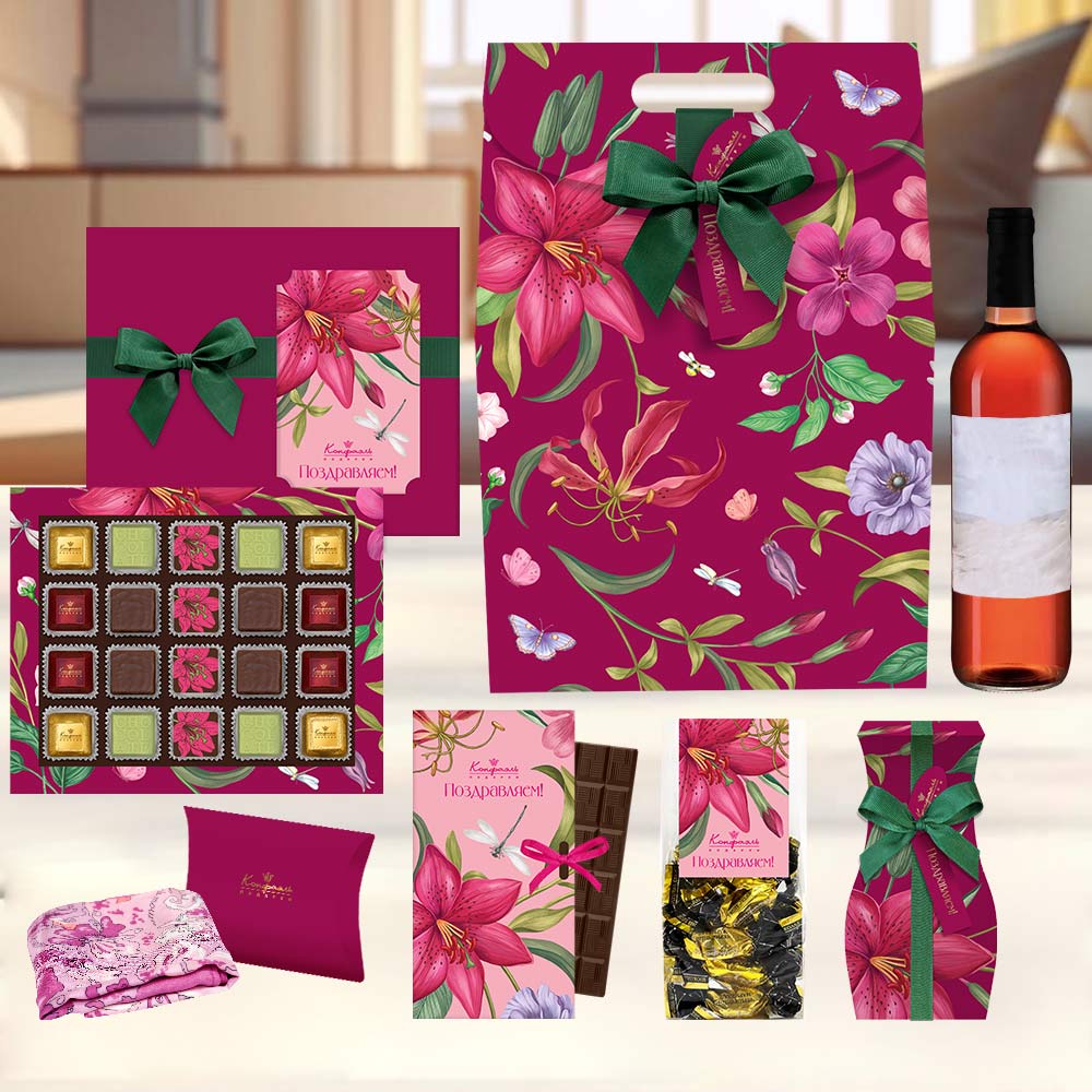 Плитка малая «Поздравляем!» / Шоколад молочный / 60 г Поздравление 20 / Шоколадныеконфеты «Ассорти» со сливочными начинками, с кремовой начинкой и декором, конфеты «Суфле» в горьком шоколаде со вкусом «Игристого розе» / 170 г Мини-пакет 02 / Конфеты «Желейные» в горьком шоколаде (черничные) / 150 г Подарок 132 / Конфеты «Комбинированные» в горьком шоколаде (вишня и ваниль) / 120 г Подарок 049 / Платок «Фиолетовые цветы» (52х52 см)