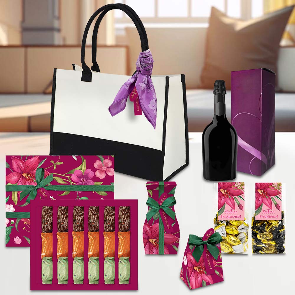 Подарок 054 / Конфеты «Комбинированные» в горьком шоколаде (вишня и ваниль, апельсин и ваниль, виноград и ваниль) / 270г Мини-пакет 02 / Конфеты «Желейные» в горьком шоколаде (виноградные) / 150 г Мини-пакет 02 / Конфеты «Желейные» в горьком шоколаде (черничные) / 150 г Подарок 132 / Конфеты «Мягкий грильяж» в горьком шоколаде / 120 г Подарок 078 / Конфеты «Сухофрукты» в горьком шоколаде (финик, слива, абрикос) / 100 г Подарок 049 / Платок «Фиолетовые цветы» (52х52 см)