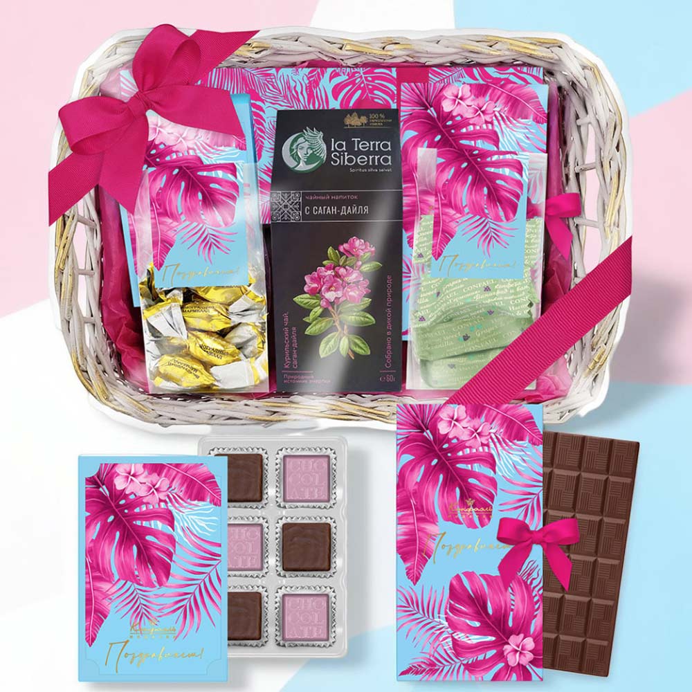 Поздравление 14 / Шоколадные конфеты «Ассорти» с шоколадной и кремовой начинками/ 145 г Поздравление 06/ Шоколадные конфеты «Ассорти» со сливочной начинкой, конфеты «Суфле» в горьком шоколаде (клубничное)/ 45 г Плитка малая «Поздравляем!»/ Шоколад молочный/ 60 г Мини-пакет 02/ Конфеты «Желейные» в горьком шоколаде (виноградные)/ 150 г Мини-пакет 02/ Конфеты «Комбинированные» в горьком шоколад(виноград и ваниль)/ 150 г Чайный напиток с Саган-Дайля/ 60г