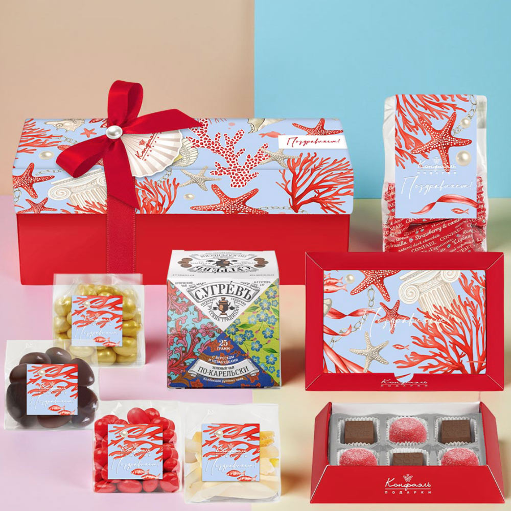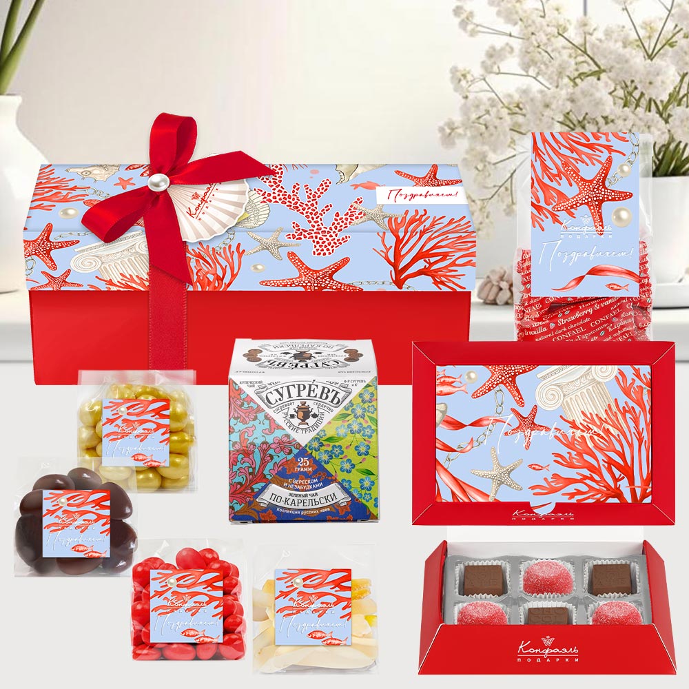 Поздравление малое 06 / Шоколадные конфеты «Ассорти» с кремовой начинкой, мармелад желейный со вкусом «Личи» / 80 г Мини-пакет 02 / Конфеты «Комбинированные» в горьком шоколаде (клубника и ваниль) / 150г Мини-пакет 01 / Драже «Клюква» в шоколаде/ 75г Мини-пакет 01 / Цукаты лимонныхкорочек в белом шоколаде / 50г Мини-пакет 01 / Драже «Ананас» вбелом шоколаде с декором / 75 г Мини-пакет 01 / Драже«Миндаль» в молочном шоколаде / 75г Чай «СУГРЕВЪ» По-карельски / Зеленыйчай с вереском и незабудками / 25 г