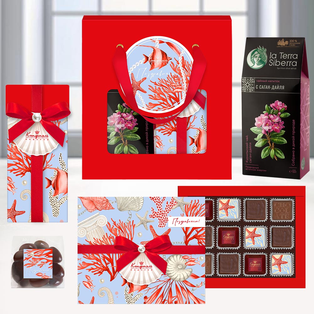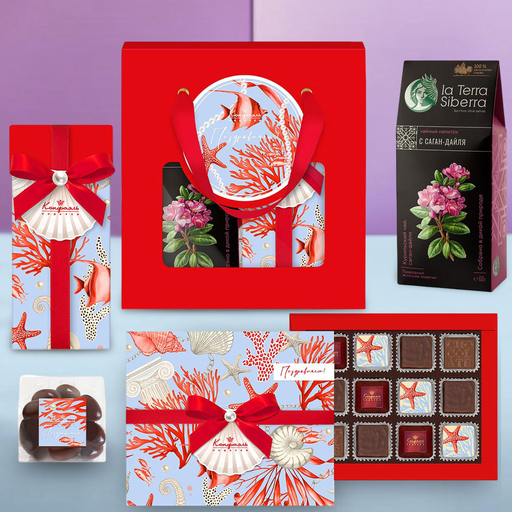 Поздравление 12 / Шоколадныеконфеты «Ассорти» со сливочными и кремовойначинкой, с кремовой начинкой и декором, конфеты«Суфле» в горьком шоколаде со вкусом «Манго» / 95 г Подарок 024 / Конфеты «Желейные» в горьком шоколаде (виноградные) / 190г Мини-пакет 01 / Драже «Миндаль» вмолочном шоколаде / 75г Чайный напиток с Саган-Дайля / 60г