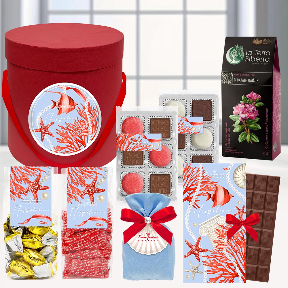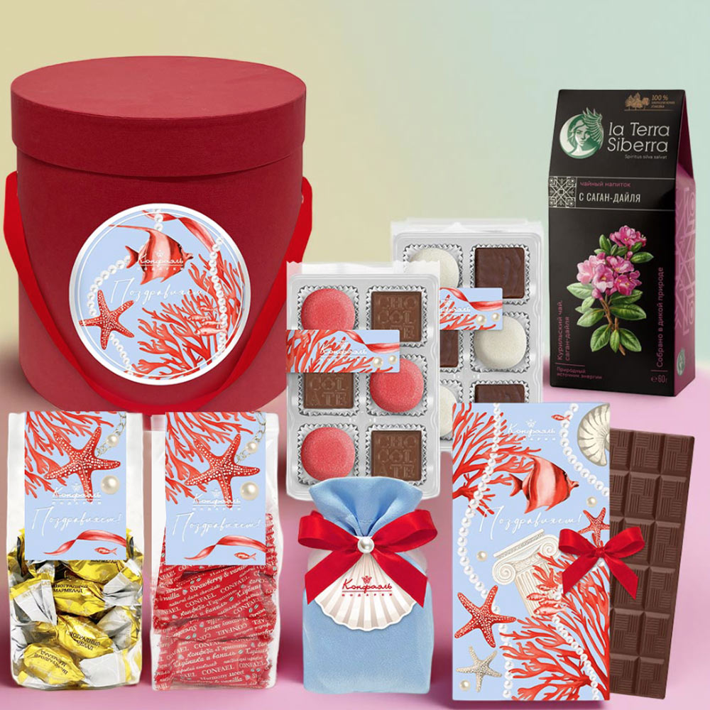 Плитка малая «Поздравляем!»/ Шоколад молочный / 60г Поздравление 06 / Шоколадныеконфеты «Ассорти» с кремовая начинкой, мармелад желейный со вкусом «Личи» / 80 г Поздравление 06 / Конфеты «Суфле» вгорьком шоколаде со вкусом «Манго», мармеладжелейный со вкусом «Сливочная намелака» / 75г Мини-пакет 02 / Конфеты«Желейные» в горьком шоколаде (виноградные) / 150 г Мини-пакет 02 / Конфеты «Комбинированные» в горьком шоколаде (клубника и ваниль) / 150г Мешок 001 / Драже «Миндаль» в молочном шоколаде / 100г Чайный напиток с Саган-Дайля / 60г
