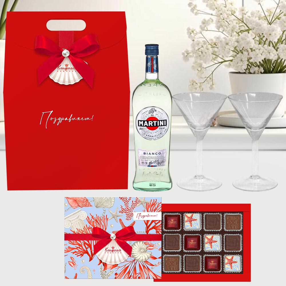 Поздравление 12 / Шоколадныеконфеты «Ассорти» со сливочными и кремовойначинкой, с кремовой начинкой и декором, конфеты«Суфле» в горьком шоколаде со вкусом «Манго» / 95 г Бокал для мартини / 2шт