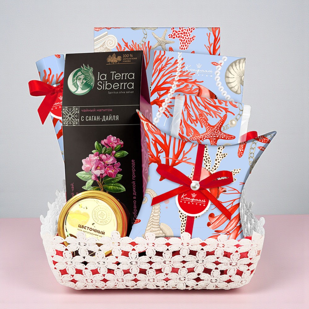 Поздравление 15/ Шоколадные конфеты«Ассорти» с кремовыми начинкам и декором, конфеты «Суфле» в горьком шоколаде со вкусом «Манго», мармелад желейный со вкусом «Сливочная намелака», со вкусом «Личи»/ 170 г Плитка малая «Поздравляем!»/ Шоколад молочный/ 60 г Мини-подарок 001/ Конфеты «Сухофрукты» в горьком шоколаде ( финик, слива, абрикос)/ 35 г Подарок 038/ Конфеты «Комбинированные» в горьком шоколаде (клубника и ваниль) / 105 г Мини-пакет 02/ Конфеты «Комбинированные» в горьком шоколаде (клубника и ваниль)/ 150 г Чайный напиток с Саган-Дайля/ 60г Мед натуральный цветочный/ 150 г