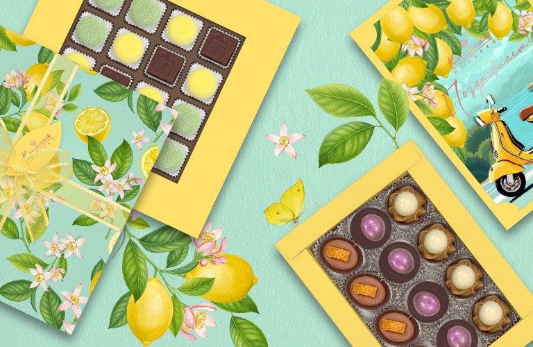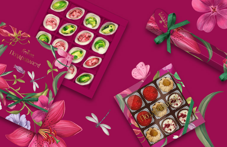 Цветочная коллекция — более сдержанная и элегантная, выполнена в благородном винно-бордовом оттенке с нежными садовыми лилиями на коробках. Она придётся по душе женщинам постарше, ценящим классику и утончённость. Среди новинок — сухофрукты в горьком шоколаде и конфеты с фруктовыми кранчами, которые добавляют изысканности каждому кусочку.