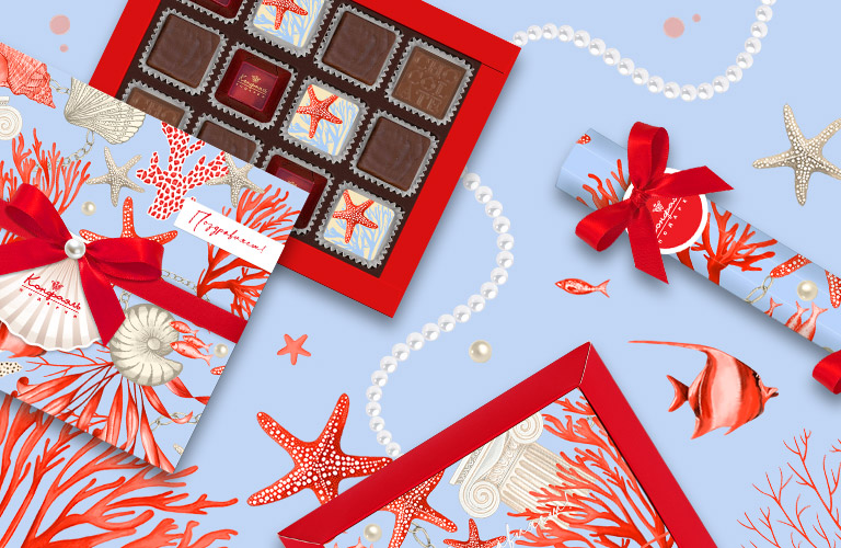 Жемчужная коллекция — универсальная и мечтательная, с тёплыми морскими тонами, принтами жемчуга и морских обитателей. Подойдёт абсолютно всем, кто тоскует по отпуску у моря. Отлично дополнит нежные букеты пастельных оттенков или классические красные розы. Главная новинка года — модные пляжные шоперы, внутри которых не только фирменные шоколадные конфеты, но и стильные пляжные аксессуары вместе с гастрономическими деликатесами.