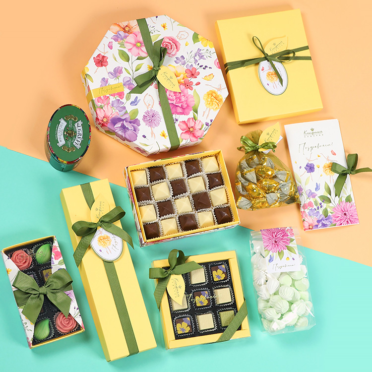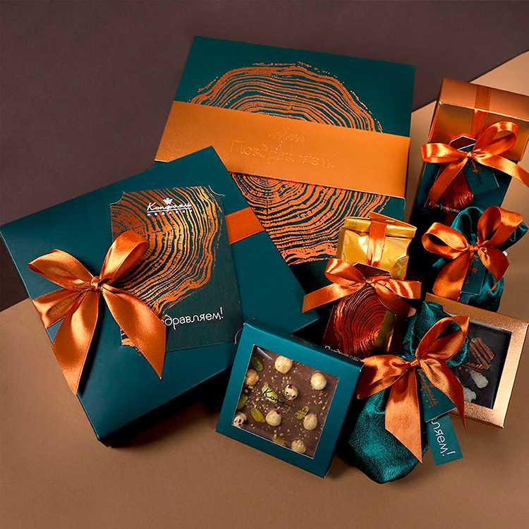 – Подарочные наборы с логотипом. Включают несколько видов шоколада и конфет.
